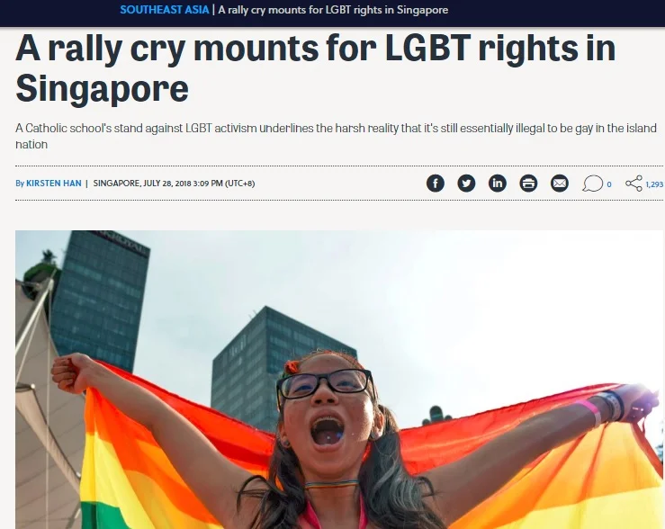 “It’s rare to see “such open and visible representation in local mainstream media,” said Leow Yangfa, executive director of Oogachaga, a support organization in Singapore for lesbian, gay, bisexual and transgender people. He said he hoped the international attention on Singapore — buttressed by the success of “Crazy Rich Asians,” a movie based in the country — might shine light on the state of gay rights there.