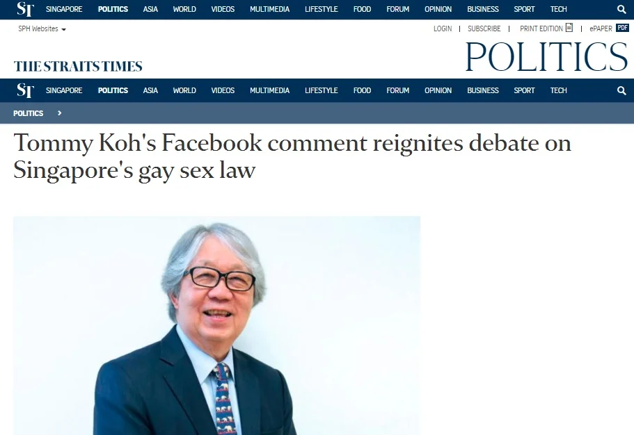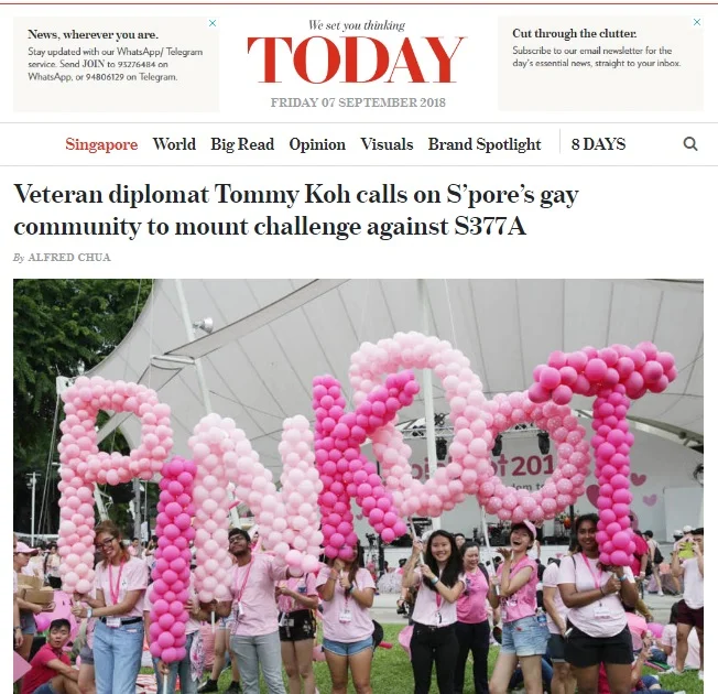 “Mr Leow Yangfa, the executive director of Oogachaga, a non-profit organisation working with the LGBT community, told The Straits Times on Friday: “We would like to thank Prof Tommy Koh for the very generous word of encouragement for us to persevere in our efforts to seek equality and justice for everyone, regardless of our sexual orientation and/or gender identity.”