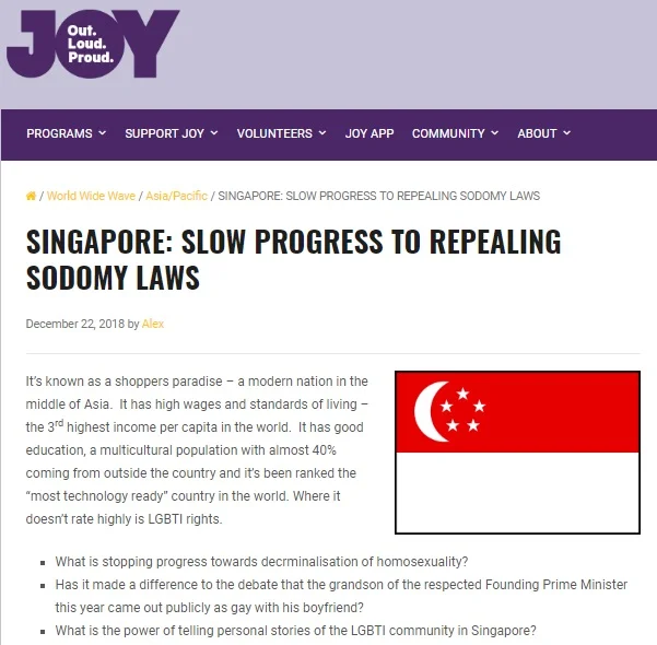 “Oogachaga executive director Leow Yangfa noted that even though Section 377A is not “proactively enforced, as reassured by PM Lee and others since 2007”, its presence “creates an environment where it is acceptable to treat members of the LGBTQ community in an unequal way”.”