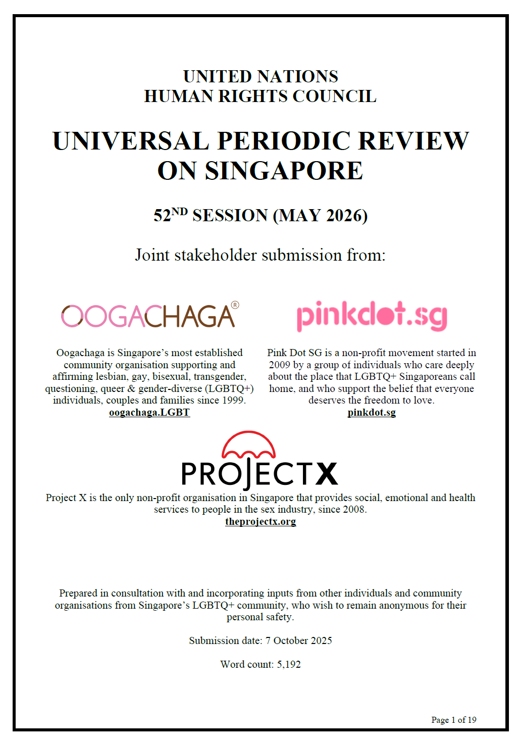 UPR joint stakeholder submission by Oogachaga, Pink Dot & Project X (October 2025)